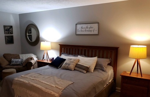 First floor: New large flat screen TV in living room, wood burning fireplace, fully equipped kitchen with stainless steel appliances, Quartz countertops, master bedroom with King and single sleeper sofa, full bath with walk-in shower and separate tub, washer and dryer and extra half bath. Living room has single sleeper sofa.