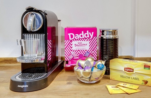 - Open-plan kitchen fully equipped with coffee, sugar and tea capsules.