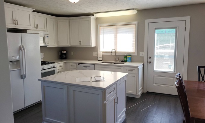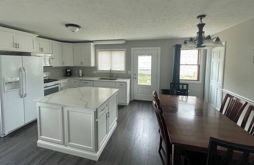 Fun for the entire family! Four 4 bedroom three full bath - kitchen has breakfast bar (will seat 10 using the table and breakfast bar - if additional seating is needed there is a folding table and chairs in the laundry room). Four flat screen TV's (Two on first floor and in two in each of the king bedrooms up stairs). Master bath includes double sinks and large walk in shower. Outside amenities include large deck and a fire pit for cool nights. Public boat launch approximately 1 mile away. The house has 88 feet of channel front; including dock and additional tie downs to leave your boat and personal water craft in the water all week long with excellent fishing right off the property. There is ample parking for 8 cars and three different private entrances. Other amenities include washer/dryer, large pantry, dressers/closets for clothes, large deck with tables and chairs, gas grill and a charcoal grill.