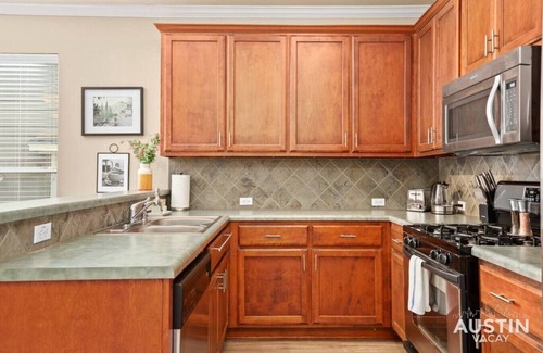 When hunger strikes, our sleek, fully-equipped kitchen answers the call. With top-tier appliances, including a handy dishwasher, and chic bar seating for four, it`s the ideal space for everything from morning coffees to dinner parties. If outdoor relaxation is your vibe, step out into our sunlit sanctuary, a tranquil setting for soaking up the Austin atmosphere.