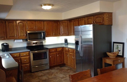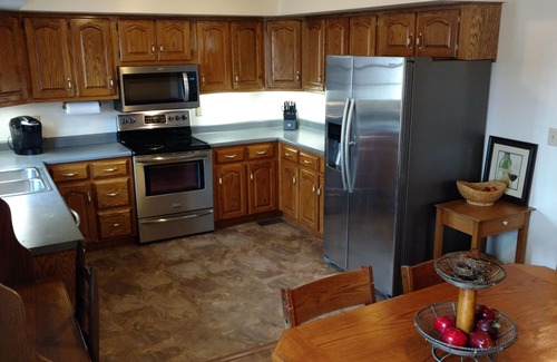 The home boasts over 4,600 square feet of space including 9 bedrooms, 4 and 1/2 bathrooms, and an eat-in kitchen, and formal dining room. The Master Bedroom has a king size bed and includes a private bath. The other 8 bedrooms offer queen size beds and twin beds. The upper level Great Room includes ample seating and a 50" HD television with Roku for guests to access their streaming services. The lower level includes another sitting/TV area and laundry area. There is a large dining room that seats 6 and the eat-in kitchen that seats 6 with stainless steel appliances. Free wireless internet service is available.