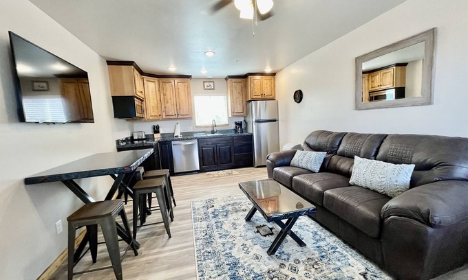 Angel Rock Rentals of Moab #9 is a brand new cozy, dog friendly, and modern rustic townhouse that sits over a 2 car garage. Perfect for couples! Angel Rock Rentals of Moab is located just 4 miles South of down town Moab. Get a refreshing nights rest in our comfortable queen size bed. The kitchen is well equipped with everything you'd need for a home cooked meal or use the electric patio grill. Take advantage of the garage to safely store the toys.