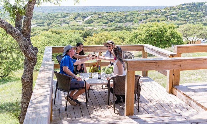 Ideal for large groups, The View at Eagle's Nest boasts magnificent 30-mile views of the Wimberley Valley. A large deck with adjoining party room is perfect for gatherings, meetings & events or to simply enjoy a glass of wine and soak in the views. Enjoy privacy and relaxation in our six comfortable units each with their own kitchen, living room, and bathroom. Amenities include BBQ grills, outdoor games, meditation labyrinth walk, and hammocks. A 3-hole frisbee/disc golf course around the property. This listing is to book ALL six guesthouses, seven units total (one guesthouse is a duplex)!