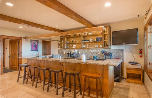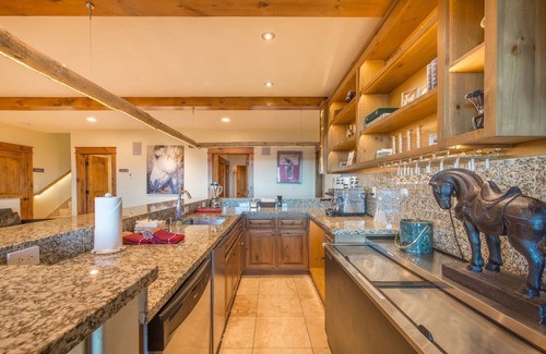 This place has everything! Spa, plunge pool, 8 persons sauna, 8 persons steam room, hot tub, gourmet kitchen, full size bar, TV's in bedrooms, great room with 22' ceilings, fireplaces and panoramic views that are amazing!