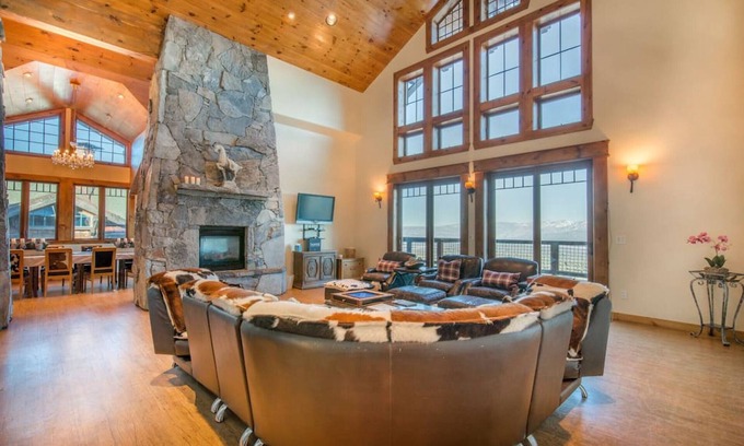 9BRM/11BTH Tahoe Villa, panoramic view, hot tub, sauna, steam-room, bar, pool table is located in Truckee. 9BRM/11BTH Tahoe Villa, panoramic view, hot tub, sauna, steam-room, bar, pool table provides accommodation, featuring Fireplace/Heating, Laundry, Pool, among other amenities. This House features Fireplace/Heating, Laundry, Pool, to make your stay a comfortable one.
