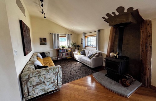 Welcome to Greenhaven Gallery Guesthouse — a thoughtfully crafted, open-concept retreat that blends clean modern design with warm, natural textures for a perfect balance of rustic elegance. Tucked away on 64 acres of rolling pasture and forest, the guesthouse overlooks the breathtaking Strathcona mountain range, offering a peaceful and inspiring setting for rest, reflection, and reconnection with nature.