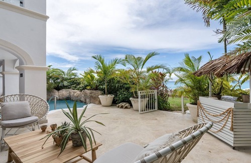Upon entering, the open-plan design immediately draws your eye through the kitchen and living room, straight onto the covered terrace. French doors effortlessly blend the generously sized living room with the terrace, creating a seamless flow between indoor and outdoor spaces and enhancing the sense of airy, open living. This unit offers a sense of privacy and seclusion. The terrace and dining area boast a large free form sunken plunge pool surrounded by natural rock, complemented by a BBQ grill, wet bar, and comfortable lounge seating under a retractable canopy —an idyllic setting for relaxation. From the gated private terrace, step directly into lush tropical gardens and 6m onto a pristine expanse of powdery white sand beach—an exceptional perk of this ground-floor unit.