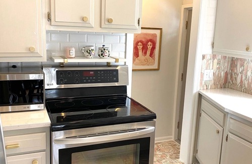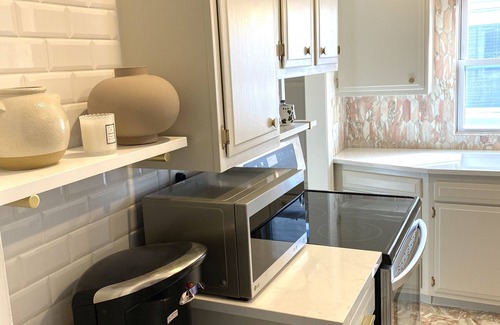 When you enter, you will be greeted by the original Indiana limestone fireplace, original hardwoods, repurposed original kitchen cabinets, sweet dining room, full bathroom with it’s original tile and two great size bedrooms. I have tried to maintain the integrity of the original home; only adding my artistic touch!