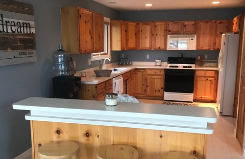 Access the private, all-sport lake from the backyard. Guests are welcome to use the paddle board, life jackets, and other water toys and accessories. There are boat rentals available from local marinas to rent for an additional fee. In summer months, enjoy swimming, fishing, basketball, biking or volleyball at the house or drive 5 short minutes to 2 scenic golf courses.