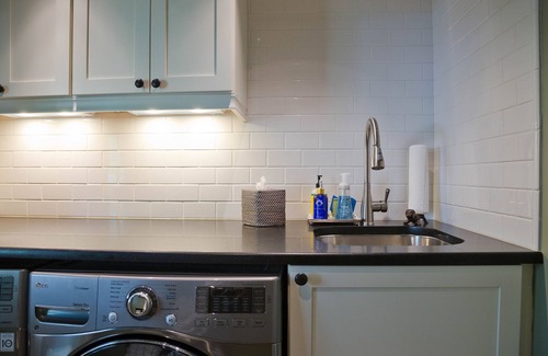 Downstairs is the Master Bedroom and 1 Guest Bedroom with spacious en suite bathrooms. Master bath includes jacuzzi tub and separate steam shower. Also downstairs is a utility/mudroom with individual storage lockers and a laundry area with Bosch front-loading washer and dryer.
