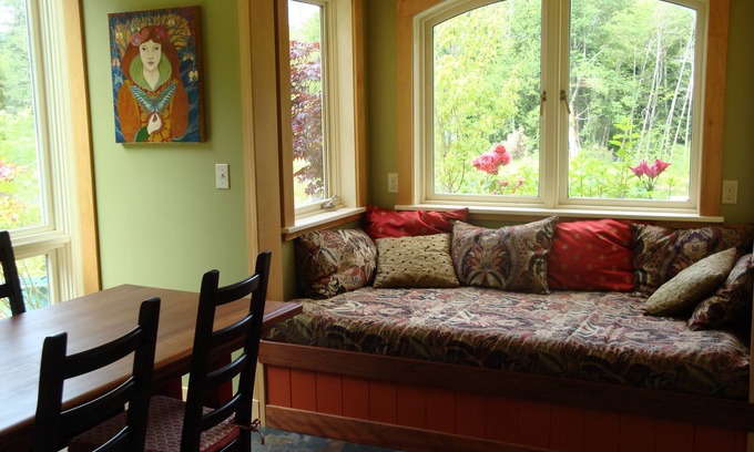 The kitchen is completely equipped for you to do your own meals . There is a large window seat for lounging . Right outside the kitchen is a patio with table and chairs for outside dining.