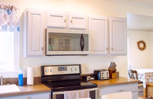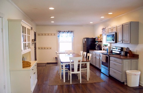 Vintage House is fully furnished and has a full kitchen, a dining area, family room, and living room with additional sofas and a 51" smart TV that is Netflix ready. Free wi-fi is of course available throughout the home. There are some toys for the young kids, and a powder/laundry room on the first floor. Upstairs there are four neatly arranged bedrooms, one of which is a 'suite' with a queen-sized bed and full bath. The second bedroom has a queen bed. The third bedroom is behind the second one and also attached to the hallway bathroom. It has a full-sized bed. The fourth bedroom has a 'twin over full' bunk bed.