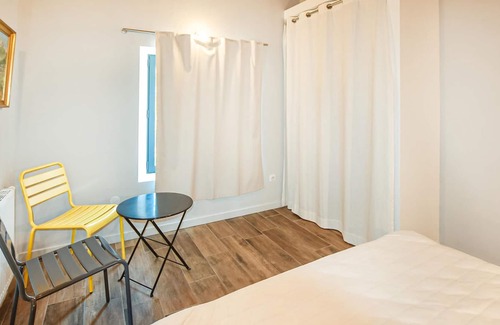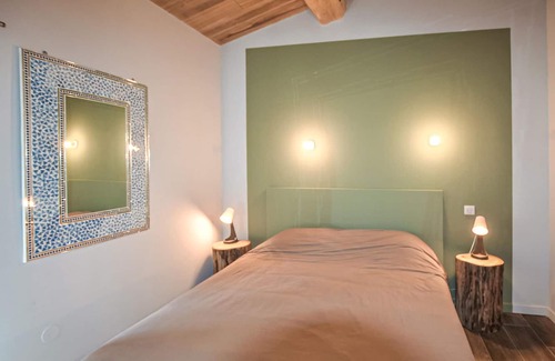 Bright colors and wooden beams emphasize the decorative and homey ambience throughout the level. With enough space for up to 6 people, the accommodation includes open-plan living and an enclosed garden with a shared outdoor pool. You can also look forward to a beautiful view of the rural and hilly surroundings with the foothills of the Monts du Vercors in the background.