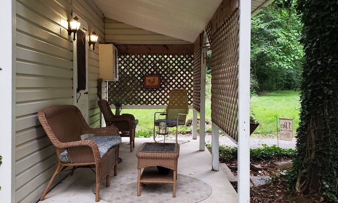 Find rest in this quaint two story CREEKSIDE cottage that comfortably SLEEPS 6, nestled in the woods of south central Pennsylvania. Look up a new recipe in our cookbooks and create delectable meals in the FULLY FURNISHED KITCHEN, browse through local history books, classic stories and children's books in FRENCH COUNTRY DECOR livingroom, build a campfire with FREE FIREWOOD and roast marshmellows over the BACKYARD FIRE RING, enjoy FRESH MOUNTAIN AIR and SPRING while you grill steaks over a PROPANE GRILL. Enjoy one of our many BOARD GAMES in the livingroom or listen to crickets while you sip iced tea from the furnished FRONT PORCH. Then tuck in for the night in one of our 2 BEDROOMS-uniquely and thoughtfully decorated with HALF BATH closeby. No laundry worries as FRESH TOWELS AND LINENS are provided and the cottage contains a LAUNDRY ROOM with washer/dryer, ironing board, iron and other extras.