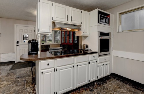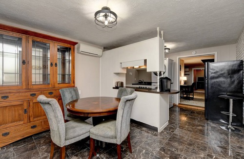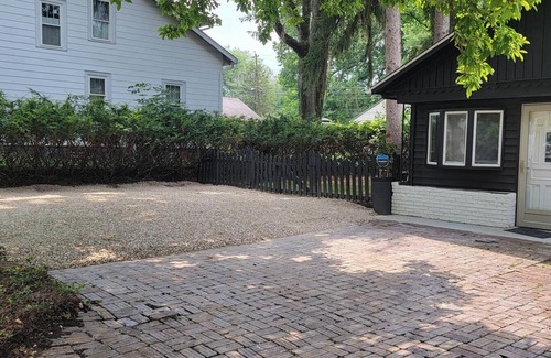 North Clintonville area. Find yourselves some peace and quiet in north central Columbus east of the Olentangy River and west of High Street relaxing under the pines. A unique getaway welcomes you with a hardscaped entryway buffered by a majestic Magnolia and sky reaching Pine trees. Rustic marble mosaic floors softened with plush furnishings create a stylish space for an open floor plan to be enjoyed for self-entertainment or coupledom for a weekend, a week, or a month. Well amenitized.