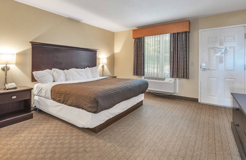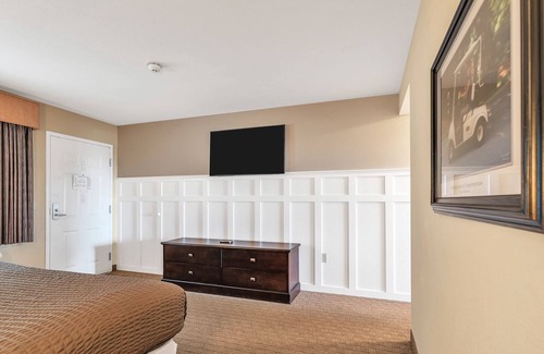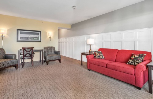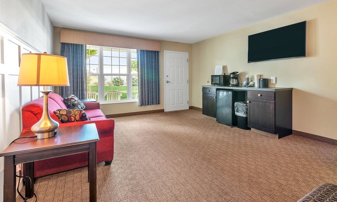Vineyard Suites 121 is a first floor suite. It is divided by the bathroom into a living room and sleeping area. The sleeping area is furnished with a king size bed and the larger living area has a full sleep sofa for that extra guest or the kids. The suite is equipped with all the amenities for an extended stay including a small refrigerator and microwave.