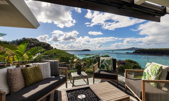 The main living space and deck are the ultimate spot to relax and take in the stunning ocean views, Okahu Bay Beach, Devonport & Rangitoto Island.