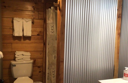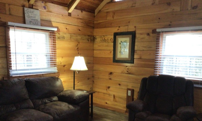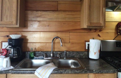 This cabin features a full kitchen, dining and living area. The kitchen is equipped with a small gas range, refrigerator, and cooking and dining basics. It has two bedrooms, king size beds, dressers, and individual heating/air conditioning units with a remote. The full bathroom is large and conveniently located in the hall between the two bedrooms. The living area has a nice oversized couch which could suffice as a sleeping space for a guest. The deck on the back of the house overlooks the wooded area that surrounds the property. The house is tucked away and private with convenient parking for unpacking.