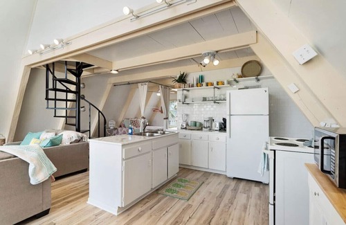 Groups will love the sunny, open layout and the relaxed, beachy vibes of this home. On the main floor, a queen-size bed sits under a paddle fan and is surrounded by gauzy curtains for privacy. Across the hallway, a full bathroom has a step-in shower. Up in the lofted space, three full-size beds— one tucked under the eaves and accessible via a ladder— make a great hang-out spot for the kids. A flatscreen television and a full-size futon complete the cool clubhouse vibes in the loft.
