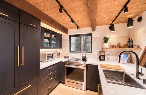 Off the living area, step onto the spacious outdoor patio where you can take in the serene pine tree views, creating an ideal space for morning coffee or evening stargazing. The adjoining kitchen is thoughtfully equipped with all the essentials, including a 4-burner electric stove, a panel-ready refrigerator, and a dishwasher. The centerpiece is a white quartz island with leather stools, ideal for meal prep or casual gatherings.