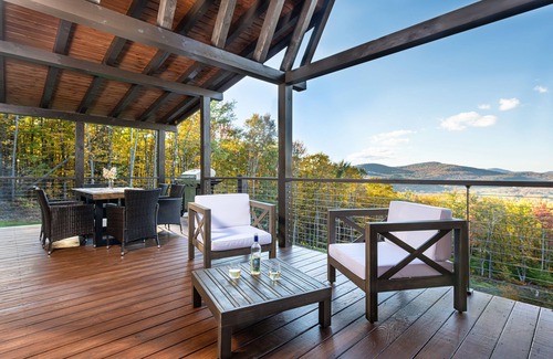 The well-appointed home features a fully equipped kitchen/dining area, living room with a stone wood-burning fireplace, two master bedrooms, a loft, and two and a half baths with features including radiant heated floors, a jacuzzi tub, and a walk-in rain shower. Perched on a private ridge, the porch, patio, and floor-to-ceiling windows all maximize the incredible panoramic view of Vermont's iconic Green Mountains.