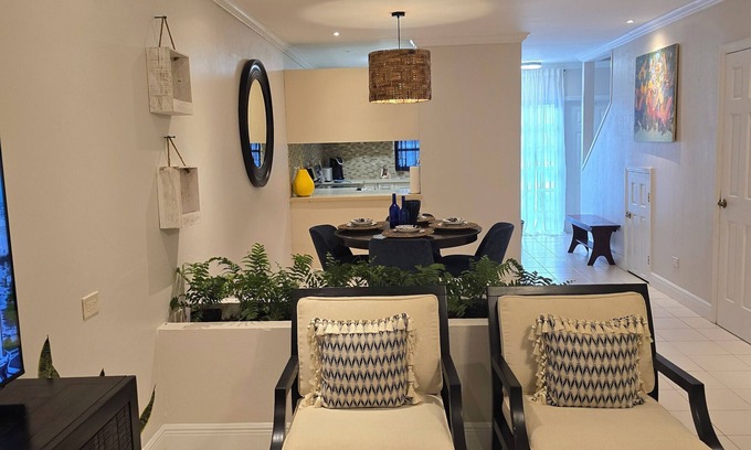 A Hidden Sanctuary, is a charming townhome in Nassau which offers guests 2 queen bedrooms and 3 bathrooms with essential amenities like WiFi, hair dryers, and AC. The cozy atmosphere and brilliant decor make it an excellent choice for your stay. Nestled in a tropical safe community only minutes away by foot from the most exciting amenities Nassau has to offer. Major hotels (Sandals and Bahamar) restaurants, picturesque beaches, swanky bars and public transportation are all just outside your front door. Only 10 minutes away from the airport and 15 minutes from Downtown Nassau, makes this the ideal accommodation for the leisure or business traveler. Experience the magic of Nassau at A Hidden Sanctuary!