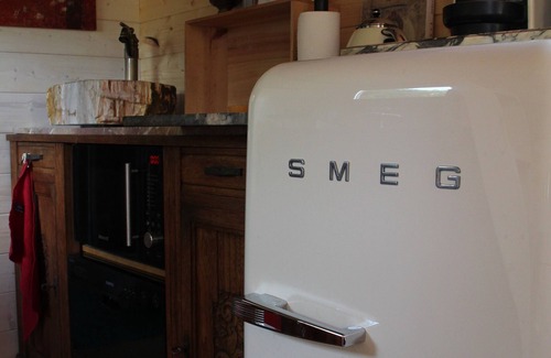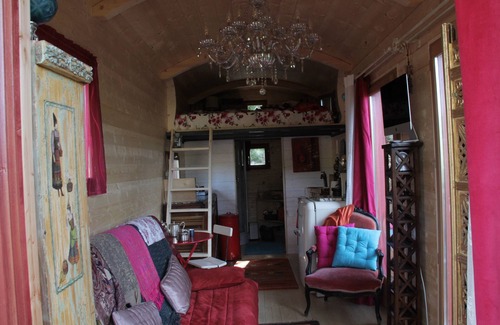 The caravan makes 21 m2, mezzanine included. Access is via the wooden terrace. Entrance on the small lounge refined, bright thanks to its 3 doors glass windows and its baroque chandelier, the sofa / bed 2 pers. Very comfortable, with mattress Bultex is posed facing the garden, a beautiful carved golden screen, a corner furniture with the unique decoration, its armchair 18th and a round table complete the living room. Each object or piece of furniture that makes up the trailer is unique, crafted, restored or hand crafted in a boho chic spirit. In the extension, a small kitchen decorated boho style chic year 30 with period furniture and marble worktop. Its design has been conceived with natural materials and it has all the conveniences, small dishwasher, microwave-oven, plate 2 fires gas, small fridge Smeg style fifties, a small sink in petrified wood laid on the plan of Marble work adds to its natural charm. The bathroom, closed by a beautiful sliding glass door year 30, has a shower, toilet, washer / dryer, towel dryer. With so much charm and naturalness, the washbasin is also in petrified wood and overlooks a window that illuminates the whole. Finally the mezzanine bedroom has a 160 cm bed with ultra comfortable memory, 2 small windows that allow you to admire the nature of your bed. All the windows open, you are also on the small terrace overlooking the shady garden with views of the Luberon and the small valley. The garden is made up of a small space for storage of your additional belongings, armchairs and tables and chairs.