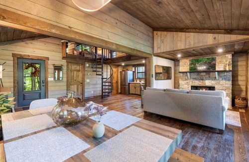 This charming 2-bedroom 2 bath unique cabin with access and views of the Cartecay River is sure to soothe, destress and revive your heart as you arrive in the beautiful North Georgia Mountains. It is sure to be an unforgettable experience! Featuring a cozy living room where you can cuddle up by the stone fireplace, in combination with a dining room where meals are shared and conversations will flow, and a well-appointed kitchen, that is perfect for a couple’s getaway or family to enjoy. A queen bed on the main level with a flat panel mounted TV and a full bathroom with a stone shower and a one-of-a-kind wash basin.