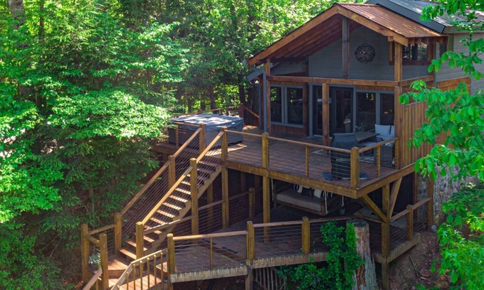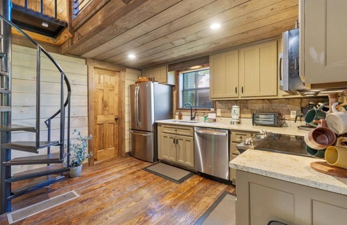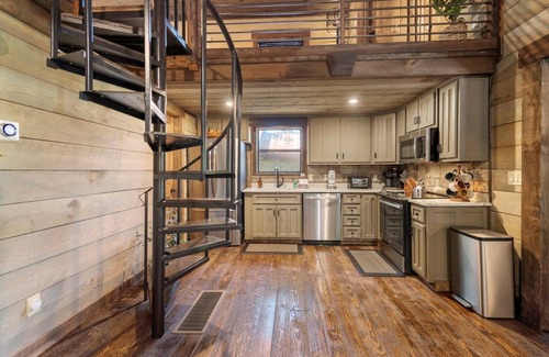 Make your way up the iron spiral staircase to the Master King room with an attached full bath and a signature stand-alone tub with a large picture window overlooking the river. Bring your fishing poles, tubes and kayaks, and enjoy the deck on the river as you catch and release your breath. Listen to the sounds of rushing water and nature, as it will renew your spirit and you will be able to take on the world once more. A bed size porch swing can be found on the lower-level patio, perfect for relaxing with a book or gazing up at the stars.