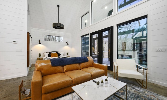 Indoor Living (sleeps 2) - Open floorplan with Smart HDTV, modern farmhouse décor with splashes of Earth tones, indoor gas fireplace, queen-sized leather sleeper sofa, chair, record player, and foyer table with games.