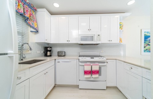 Your private patio consist of a dining table with four chairs, great for eating breakfast and lunch, plus a comfy chaise lounge to sit and enjoy the fabulous view of the beach and tropical grounds This is a great place for children to run and play. A Webber grill is provide for your outdoors cooking. The bright kitchen has everything one would need with a dishwasher, stove, microwave, blender, toaster as well as a new full sized refrigerator. Also, there are plenty of dishes, glasses, flatware and cooking utensils.