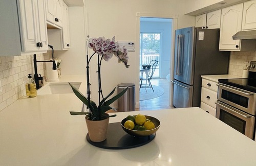 The Kitchen: The kitchen boasts a sleek all-white design, complete with upgraded appliances, including a double oven and a wine refrigerator.