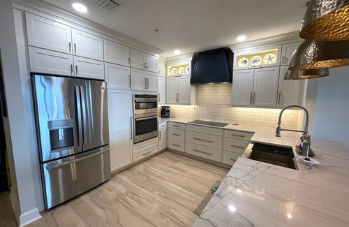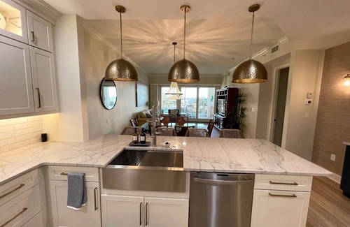 A beautifully appointed open floor plan boasts 10'-14' ceilings, 8' solid core interior doors, new vinyl plank flooring, floor-to-ceiling windows and doors out to the Lanai, and thoughtful, luxurious furnishing throughout makes this home a perfect getaway. The family room and both bedrooms feature flat-screen televisions.