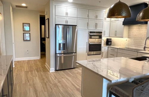 This home sleeps up to six in the two large bedrooms and a queen-sized sleeper sofa in the living room. The master bedroom features a flat-screen TV, a comfortable king-sized bed, and a walk-in closet. This bedroom opens up to the beautiful Lanai and a view of the Intercoastal waterway. The master ensuite bath has a double vanity, a walk-in shower, and a separate soaking tub. The second bedroom also features a flat-screen TV, a king-sized bed, and a large closet. This ensuite bath features a single vanity and a tub/shower combination. This condo also features a half bath for guests near the entryway. All bedding and towels provided.