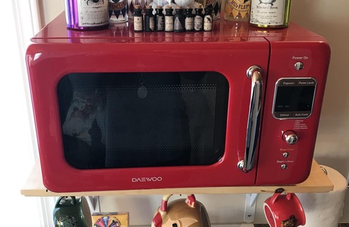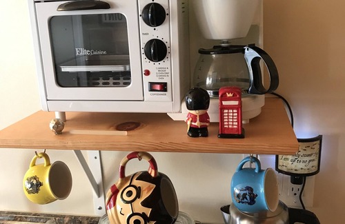 The Kitchen has a small fridge, microwave, coffee maker, electric kettle, electric burner, toaster and a s'more maker. All s'more items and movie snacks included!