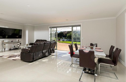 A Majestic Slice of Heaven offers accommodations in Karaka, 15 miles from Mount Smart Stadium and 16 miles from Ellerslie Racecourse. With free private parking, the property is 8.5 miles from Auckland Botanic Gardens and 14 miles from Howick Historical Village. Outdoor dining is also possible at the villa. This villa includes 5 bedrooms, 3 living rooms and a flat-screen TV, an equipped kitchen with a dining area, and 2 bathrooms with a bath and a washing machine. Towels and bed linen are provided in the villa. For added privacy, the accommodation has a private entrance and soundproofing. Guests can also relax in the garden. Ellerslie Events Centre is 16 miles from A Majestic Slice of Heaven, while ASB Showgrounds is 17 miles away. The nearest airport is Ardmore Airport, 5 miles from the accommodation.