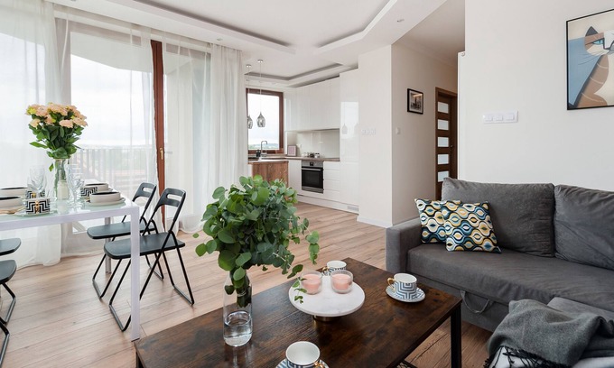 This beautiful, newly renovated and modernly furnished apartment is located on the 4th floor, in a building with an elevator and a parking space in the underground garage. It was designed in such a way as to ensure a comfortable stay for four people. It consists of a living room with a kitchenette, TV and dining area, one independent bedroom and a bathroom. In the living area, a double sofa bed will provide a comfortable place to sleep for two people. The kitchen area has been fully equipped with all necessary appliances, including dishwasher and coffee maker. The bedroom has a comfortable Queen Size bed, and the bathroom includes toilet and shower. The apartment offers access to satellite TV and high-speed wireless Internet WIFI. Our motorized guests will undoubtedly appreciate the possibility of leaving their vehicle under a roofed parking space in the underground garage. Additional seating space is provided by a large, approx. 12-meter balcony with a table and patio furniture. On hot days, an unquestionable advantage will be the possibility of cooling the room with the installed air conditioning system.