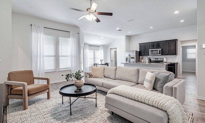 Looking for a family-friendly home that checks all the boxes? This fresh, modern beauty offers comfort and convenience. Located between I-35 and Chisholm Trail Parkway, getting around is a breeze. Inside, you'll find warm natural tones, stone countertops, and wood-look tile floors. Need a workspace? The separate office is the perfect bonus. The primary suite features a spa-like garden tub and walk-in shower, while the guest bedrooms are spacious enough for everyone. Step outside to a large backyard, perfect for family gatherings. Plus, the built-in security system means peace of mind. And here’s the cherry on top: stay over 30 days, and you won’t pay a dime in taxes—we’ve got that covered.