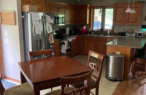 Location, Location, location! Enjoy the seclusion of Breezy Valley while still being close to everything Raystown has to offer. Walk a half mile from the top of the driveway down to the lake to swim, fish, & kayak or drive 3 miles to the James Creek boat launch & put your boat in the water! Breezy valley is a spacious, three-story home on 3 acres of woods surrounded by state game lands. Please note: the turn off of Clappers Run onto Oakwood is pretty steep and contains only gravel. Boat trailers have made the turn as well as large trucks. The first-floor layout is open concept featuring a cozy living room with a wood burning fireplace, fully equipped kitchen with a peninsula, and a high-top breakfast table that seats 4. A King master suite with a jacuzzi tub, a half bath, and a laundry room is also located on the first level. The second floor boasts a King bedroom with work desk & TV, 2 large Queen bedrooms, and a double bed with a pull out single. There is also a full bath with a shower/tub combo on this level. NEW this year, is a fully finished basement featuring a pool table, sitting area with large TV, table that seats 6 for games or an additional eating space. Outside you can relax and enjoy nature while sitting on the wrap around covered porch, having a campfire at the fire pit, or cooking dinner on the 3-foot Blackstone (propane provided). Trough Creek State Park and Raystown resort less than five miles away. Many other attractions are all within 5-10 miles in any direction. Escape to the woods & recharge at Breezy Valley!
