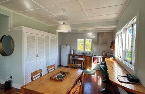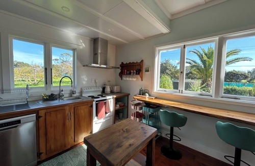Summary/ Welcome to Green Turtle Cottage, a newly renovated, colorful and modern, rural refuge designed for your Far North journey. Guests enjoy high quality kitchenware and essentials for group dining, quality beds and linens, a large deck, bbq, parking for cars and boats, Starlink (satellite) internet, and a convenient location en route to Cape Reinga, close to the local shop and cafes. Full Description/ Green Turtle Cottage is a charming newly renovated vintage cottage with a fresh, spacious, and light feel. The kitchen is equipped with high quality kitchenware and essentials for group dining. The bedrooms have Innature brand products for excellent support and comfort. There is beautiful warm lighting throughout. We have curated this rural refuge with playful and colorful decor inspired by the sea for your delight and comfort. There are two bedrooms, two bathrooms, a lovely workspace, and open floor plan living, dining, and kitchen with veranda doors that open out to a large deck with outdoor tables and BBQ. Walk out the door for a 40 min walk to Houhora Heads Harbor or drive 2 min. The cottage has plenty of parking for cars and boats and a fishing station behind a two car garage. We have Starlink (satellite) internet which is a consistent and powerful connection, perfect for remote work. The first bedroom has a queen bed with mattress by Innature, a New Zealand brand designed for organic/natural support and comfort, and an attached bathroom. Most bedding is 100% cotton in both bedrooms. The second bedroom is larger with a King bed, including an Innature topper, for support and comfort. There are closets and hanging space in both bedrooms. On the exterior deck is an outdoor dining table, large picnic table, hammock, BBQ, bench, shade sail, and umbrella. Around the cottage is open land, avocado trees, and some large palms. Views include the peaceful rural setting around the house, beautiful sunsets on the deck, and the most amazing starry sky. We hope to provide you with a perfect refuge for your Far North journey, with easy access to Houhora Harbor, pristine east coast beaches, 90 mile beach, and Cape Reinga. Green Turtle is also very well set-up for long-term remote work stays. Conveniently located close to local shops and cafes and en route to the Cape.