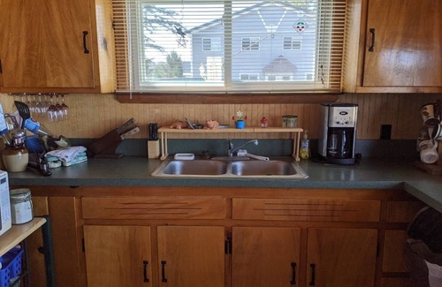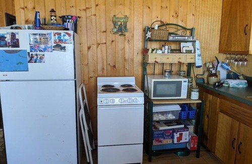 There is a full kitchen with everything you might need. Full size refrig, stove, oven, microwave, coffee maker, pot, pans , plates, dishes, utensils, glasses, napkins, paper towels, hot pads, and even a cork screw. There is a bar with bar stools to eat in the kitchen, however we try to eat outside as much as possible. In the living room you will find a full L couch that opens up to a bed, a rocking recliner, Samsung smart TV with cable, electronic fire place on the wall, and WIFI. There is a large window facing the lake with beautiful full views of the beach and lake. We provide a coleman grill and grilling utensils for those that enjoy grilling. Around the non lake side of the Cottage is area with swings and monkey bars for the kids. We supply a paddle boat for your pleasure aswell.