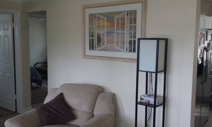 This central air conditioned home has 2 bedrooms which sleep 5, 1 bathroom and an open floor plan which includes a breakfast bar with seating for 4, in addition to a dining room. The front bedroom has a dedicated workspace with desk and monitor. There is also an inflatable air mattress available which can increase your sleeping capacity if needed. Each room has ceiling fans to increase your comfort level, a 46" flat screen tv and wi-fi service. All streaming services are available on our Roku TV. New window shades for maximum comfort, and blackout shades in each bedroom, were installed in 2024.