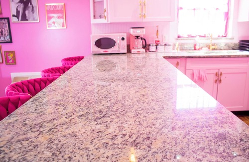 A large, cozy, and all pink apartment located just outside of Midtown Manhattan in a small urban town 20 minutes away in West New York, New Jersey. In The Pink Suite you will experience the beauty of all different pink shades with accents of gold and brass. Experience living in a real-life dollhouse for your vacation stay.
