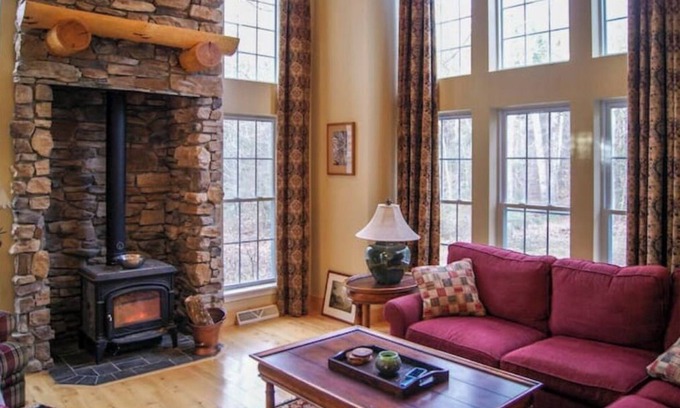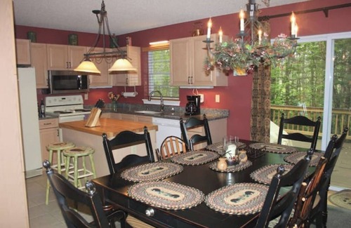 Our mountain, getaway house mixes rustic and luxury decor and is located in a quiet and private community. It‘s on a 1+ acre wooded lot, a perfect place to relax and unwind. The house has a beautiful open floor plan with cathedral ceilings and a wood stove with a floor to ceiling stone wall in the living room.
