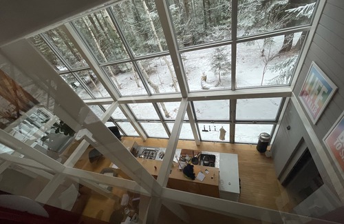 A Prism in the Wood is an award winning architecturally designed home nestled in the woods of Mt. Desert, through which passes the constantly changing light of the Maine seasons. The house is a frame of steel tubes completely enclosed in glass with the living spaces within floating like platforms through the grid. A light steel stair reaches up through the steel tubes to the second floor and a further spiral stair connects to the owner’s private quarters on the uppermost level. The levels are also connected by a free-standing glass elevator, the use of which is reserved to people above 21 year-old without children.