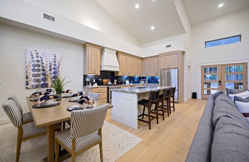 Step inside to a spacious open-concept living area featuring floor-to-ceiling windows, a custom stone fireplace, and stylish furnishings throughout. The fully equipped kitchen includes stainless steel appliances, a drop coffee maker, a single-cup Keurig, and all the cookware you’ll need. Enjoy meals at the custom dining table for six, or gather around the kitchen island that seats three.