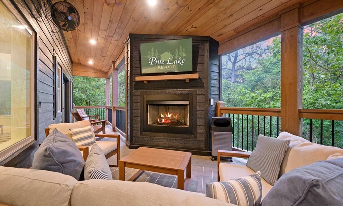 Just outside, you’ll find two separate outdoor living spaces designed for both relaxation and entertainment. Unwind in the oversized hot tub, watch your favorite shows on the outdoor HDTV, or relax in the rocking chairs with a view of the surrounding pines. Challenge your group to games like shuffleboard or horseshoes. Off the deck, a Breeo® smokeless fire pit provides a cozy gathering spot without the hassle of smoke.