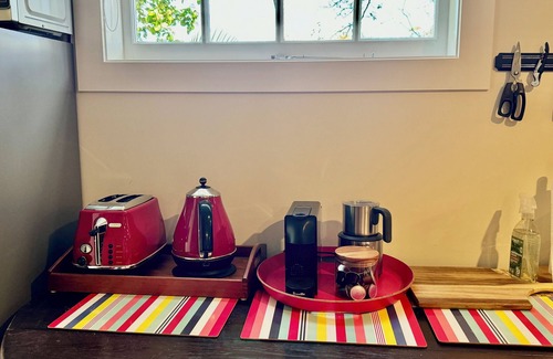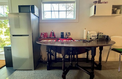 We supply a daily simple continental breakfast and wifi. The 40sqm space includes a queen bed, wardrobe, dining and serving space, lounge with couch, armchair, ottoman and smart TV. The ensuite bathroom enjoys a powerful shower, heated towel rack and large sink which can be used to wash dishes. The studio has elevated garden views and art lovers will enjoy the design notes and contemporary artworks. You will have an iron, ironing board, hairdryer, wardrobe and large refrigerator. NOTE there is no kitchen sink or cooking facilities, yet we have all you need for that getaway or business trip - microwave, toaster, kettle, Nespresso machine, milk frother, crockery, utensils, and dish rack.