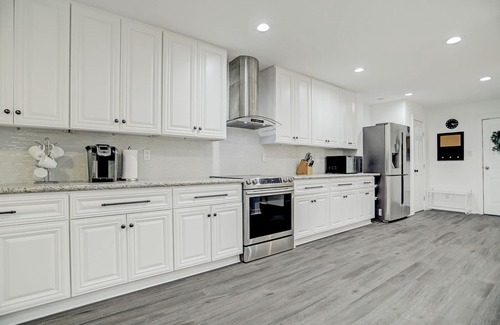 The kitchen is fully equipped with fridge, cook range, dishwasher, microwave, wine fridge, Keurig machine, coffee pods, creamer, tea, cooking necessities.