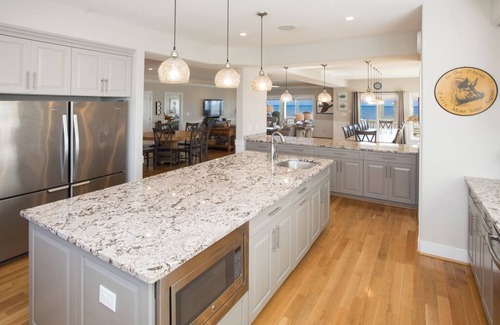 The main living space is located on the second floor. Warm and inviting Coastal decor abounds! The living and dining areas are exquisitely decorated with uninhibited views of the Atlantic. The dining area is ideal for entertaining the whole family! Aside from the east facing living room there is also an additional seating area on the west side of the home with a wet bar. A great spot to get away and enjoy a book or refreshing cocktail! Ready to whip up a few family style meals? The chef's kitchen will not disappoint! Well appointed with two dishwashers, two ranges, two refrigerators, breakfast bar, and an oversized pantry. Tucked away from the hustle and bustle, you will find a spacious King suite with comfortable furnishings, deck access, with a private full bath.